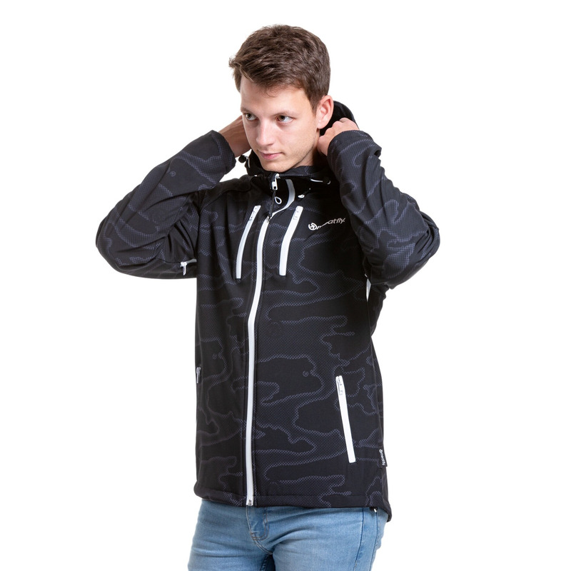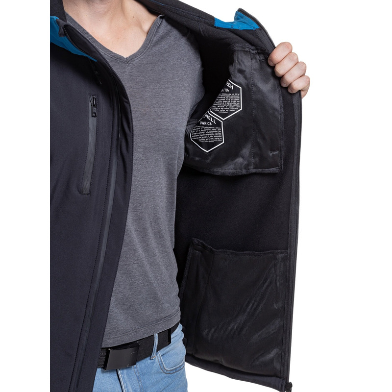 ✅ Bunda je vyrobena z třívrstvého softshellu s fleecovou podšívkou, který je voděodolný a prodyšný.